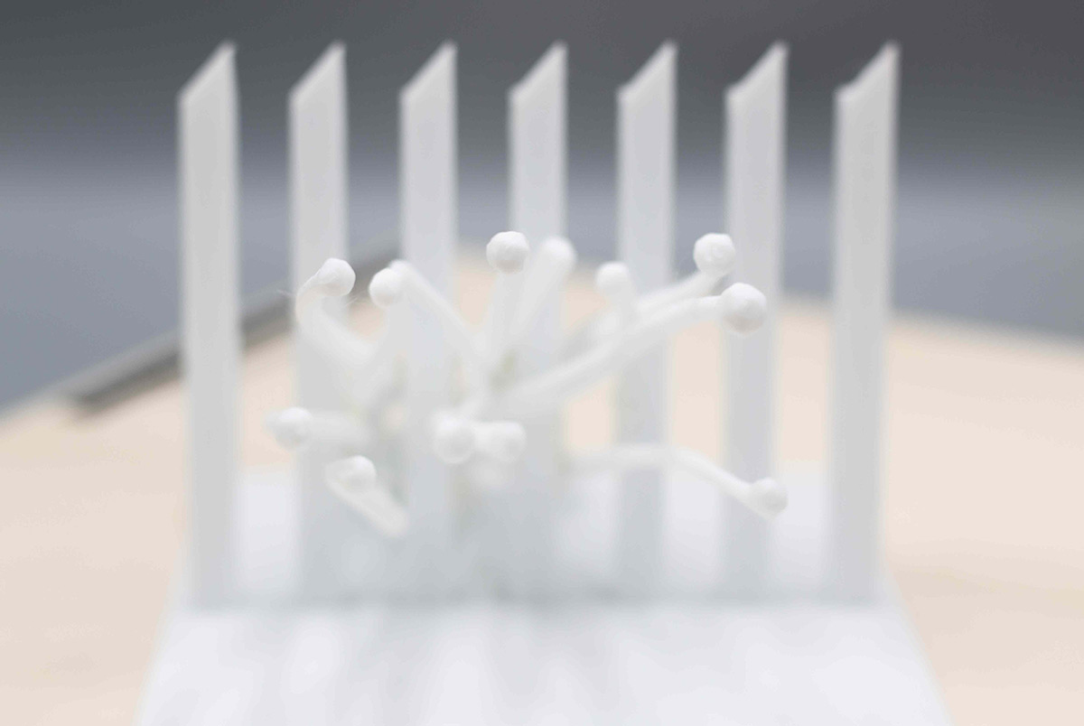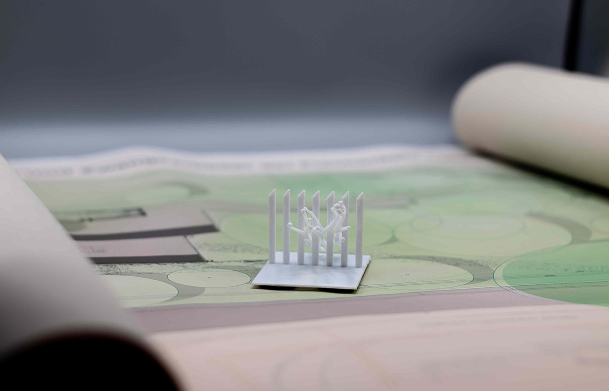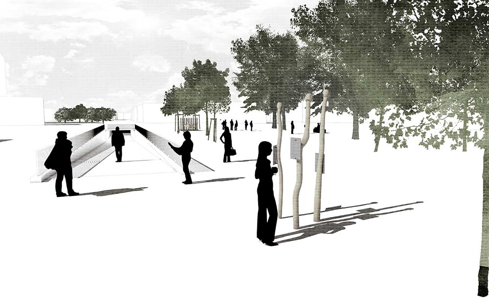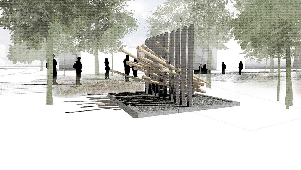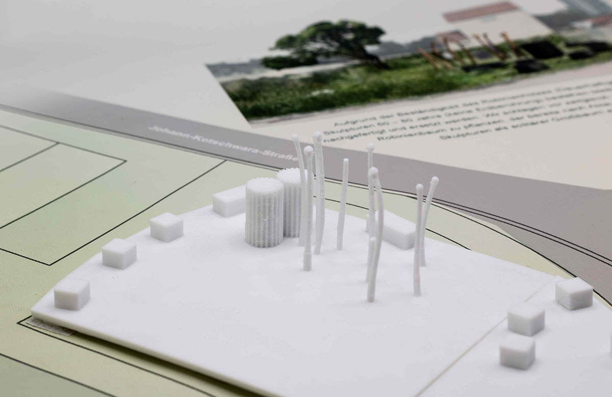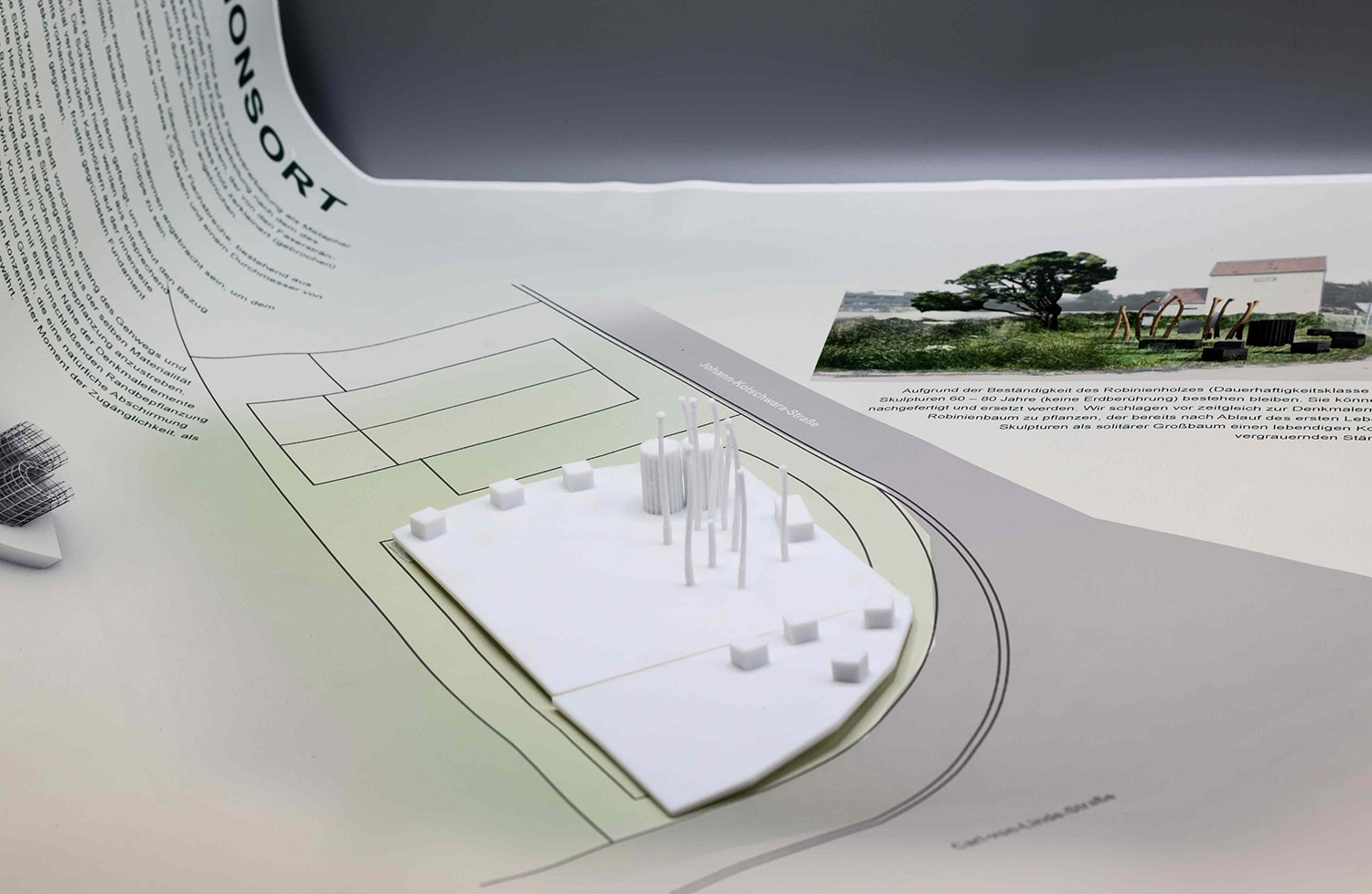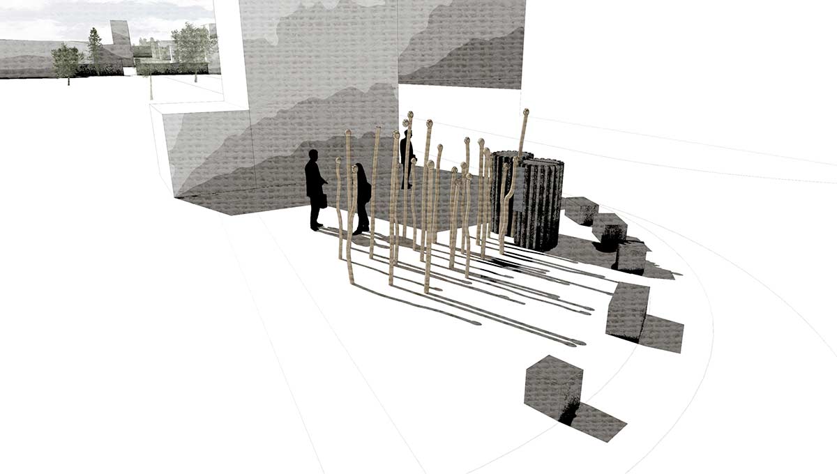 Die Visualisierungen sind Bestandteil der ersten Stufe des Wettbewerbs. Nach erfolgreicher Vorauswahl war in der zweiten Stufe die Einreichung maßstäblicher Modelle gefordert. Die folgenden Modelle des Informationsortes und der Denkmalskulptur in jeweils im Maßsstab 1:25 und 1:50 waren meine ersten selbstmodellierten und gedruckten Objekte1\ DENKMALSKULPTUR Vom röm Wort für Bund: „fascio“, leitet sich der Begriff Faschismus ab. Demnach sind Faschisten „Bündler“. Das römische ‘Fascis’, Symbol und Namensgeber der italienischen Faschisten, ist ein Rutenbündel mit eingesetztem Beil, das aus der Mitte he r aus steht. Das Beil symbolisierte die Todesstrafe. Auch Flachsstängel werden zunächst bei ihrer Ernte gebündelt und dann über viele Arbeitsschritte weiterverarbeitet. Unsere Skulptur ist einem Riffelblock, einem der Werkzeuge aus der Flachsverarbeitung, nachempfunden. Den Flachsstängeln werden mithilfe der Riffel deren Samenkapseln (oder ‘Köpfchen’), abgerissen. Wenn die Flachsbündel durch die Riffel gezogen werden, werden sie geordnet, gekämmt, in Form gezwungen. In unserer überlerebensgroßen Skulptur werden beschnitzte Robinienstämme werden große angespitzte Betonpfeiler gekämmt. Die Robinienstämme (Länge zwischen 2,50 m und 3,00 , Ø12-18 cm) strahlen,obwohl sie ohne der Rinde ihres natürlichen Schutzgewands beraubt sind, etwas Lebendiges, so wie auch die Schicksale der Opfer der Zwangsarbeit in Lohhof durch jüngste Forschungsarbeit und der Widmung durch dieses Monument, im Bewusstein der Menschen wieder auferleben sollen. Das Holz ist einseitig in Fundamenten, untereinander, sowie in den Riffeln unsichtbar verschraubt. Durch die naturbelassene Oberfläche vergraut dieses mit den Jahren. Die einzelnen Riffel sind einzeln, vor Ort gegossene Betonsäulen, die in Ihrer Körnung, Materialität und Anstrich dem Eingangstor zur ehemaligen Flachsröste nachempfunden. Sie stehen somit in einem markanten Gegensatz zur natürlichen Oberfläche der Holzstämme. Sie stehen als Symbol für den Faschismus und die kalte Macht und Gewalt, mit der das autoritäre Regime im nationalsozialistischen Deutschland die Menschen ihrer Individualität beraubte. Die Skultpur steht innerhalb einer etwa 3,00 x 3,00 m großen eingefassten Fläche, aufgeschüttet mit Betonschroppen. Die einzelnen Stängel des Flachsbündels zeigen in Richtung des „Weges der Erinnerung“.