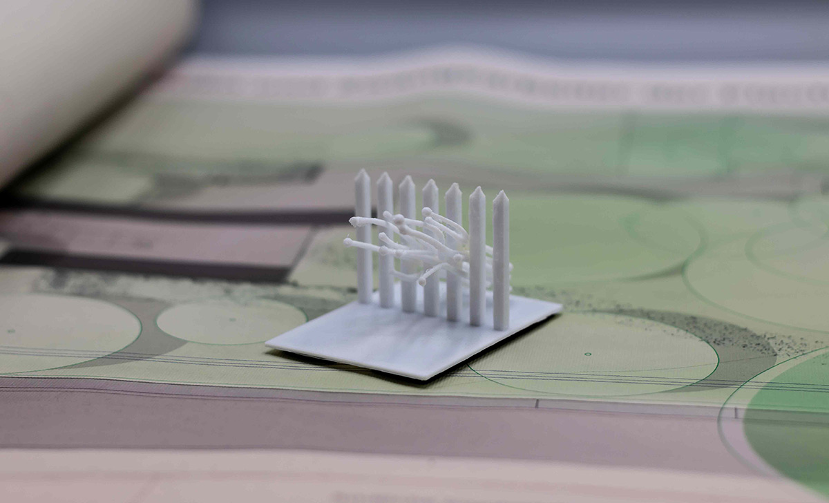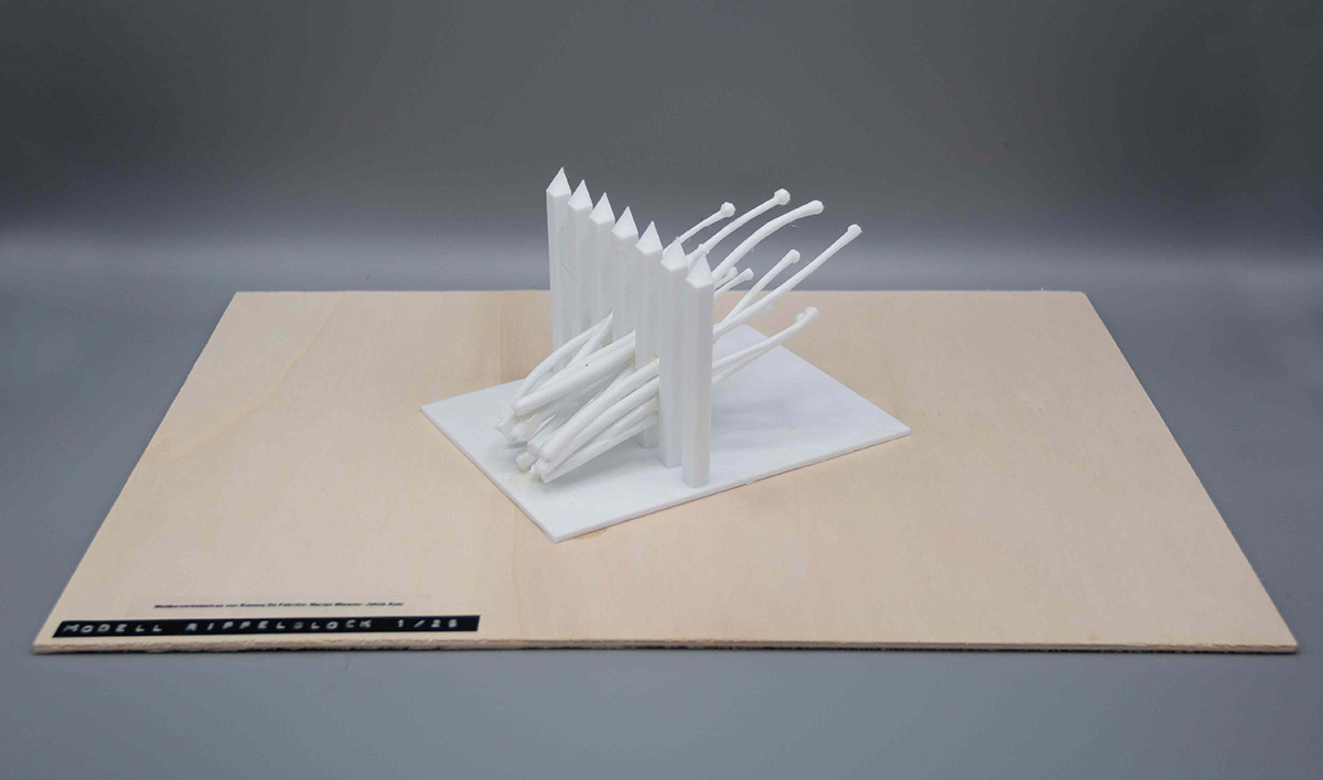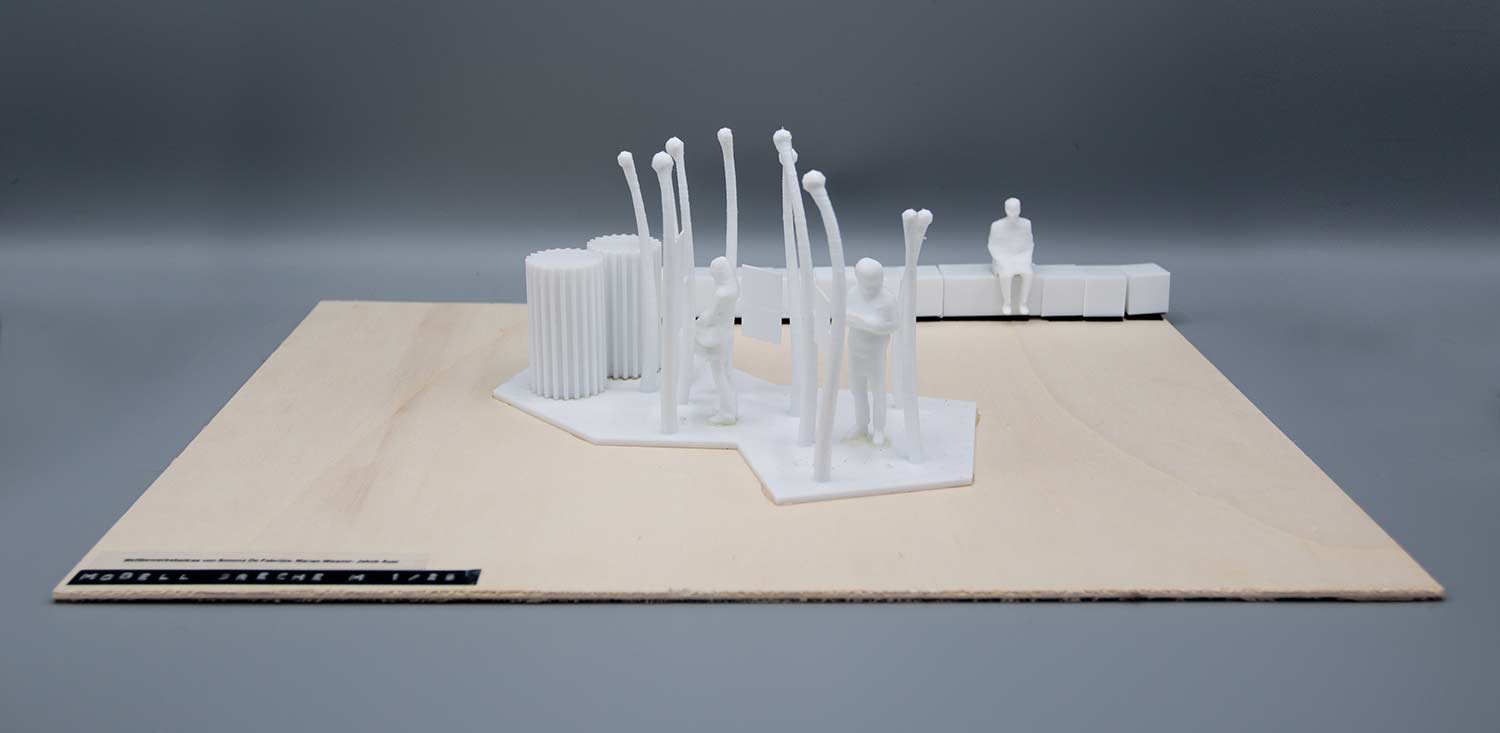 Die Visualisierungen sind Bestandteil der ersten Stufe des Wettbewerbs. Nach erfolgreicher Vorauswahl war in der zweiten Stufe die Einreichung maßstäblicher Modelle gefordert. Die folgenden Modelle des Informationsortes und der Denkmalskulptur in jeweils im Maßsstab 1:25 und 1:50 waren meine ersten selbstmodellierten und gedruckten Objekte1\ DENKMALSKULPTUR Vom röm Wort für Bund: „fascio“, leitet sich der Begriff Faschismus ab. Demnach sind Faschisten „Bündler“. Das römische ‘Fascis’, Symbol und Namensgeber der italienischen Faschisten, ist ein Rutenbündel mit eingesetztem Beil, das aus der Mitte he r aus steht. Das Beil symbolisierte die Todesstrafe. Auch Flachsstängel werden zunächst bei ihrer Ernte gebündelt und dann über viele Arbeitsschritte weiterverarbeitet. Unsere Skulptur ist einem Riffelblock, einem der Werkzeuge aus der Flachsverarbeitung, nachempfunden. Den Flachsstängeln werden mithilfe der Riffel deren Samenkapseln (oder ‘Köpfchen’), abgerissen. Wenn die Flachsbündel durch die Riffel gezogen werden, werden sie geordnet, gekämmt, in Form gezwungen. In unserer überlerebensgroßen Skulptur werden beschnitzte Robinienstämme werden große angespitzte Betonpfeiler gekämmt. Die Robinienstämme (Länge zwischen 2,50 m und 3,00 , Ø12-18 cm) strahlen,obwohl sie ohne der Rinde ihres natürlichen Schutzgewands beraubt sind, etwas Lebendiges, so wie auch die Schicksale der Opfer der Zwangsarbeit in Lohhof durch jüngste Forschungsarbeit und der Widmung durch dieses Monument, im Bewusstein der Menschen wieder auferleben sollen. Das Holz ist einseitig in Fundamenten, untereinander, sowie in den Riffeln unsichtbar verschraubt. Durch die naturbelassene Oberfläche vergraut dieses mit den Jahren. Die einzelnen Riffel sind einzeln, vor Ort gegossene Betonsäulen, die in Ihrer Körnung, Materialität und Anstrich dem Eingangstor zur ehemaligen Flachsröste nachempfunden. Sie stehen somit in einem markanten Gegensatz zur natürlichen Oberfläche der Holzstämme. Sie stehen als Symbol für den Faschismus und die kalte Macht und Gewalt, mit der das autoritäre Regime im nationalsozialistischen Deutschland die Menschen ihrer Individualität beraubte. Die Skultpur steht innerhalb einer etwa 3,00 x 3,00 m großen eingefassten Fläche, aufgeschüttet mit Betonschroppen. Die einzelnen Stängel des Flachsbündels zeigen in Richtung des „Weges der Erinnerung“.