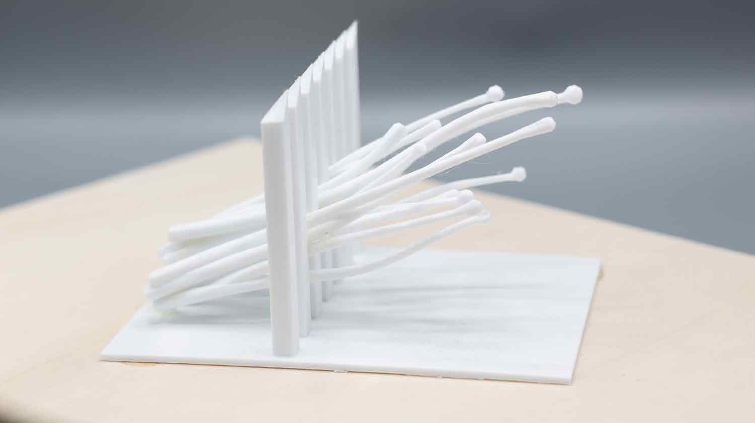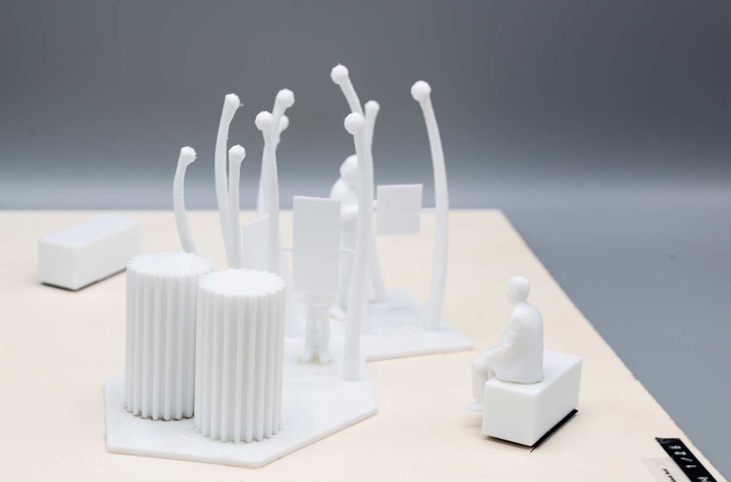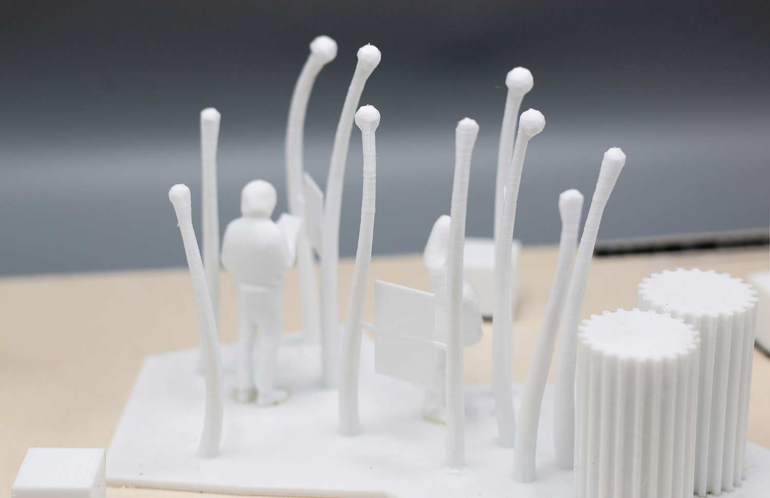Die Visualisierungen sind Bestandteil der ersten Stufe des Wettbewerbs. Nach erfolgreicher Vorauswahl war in der zweiten Stufe die Einreichung maßstäblicher Modelle gefordert. Die folgenden Modelle des Informationsortes und der Denkmalskulptur in jeweils im Maßsstab 1:25 und 1:50 waren meine ersten selbstmodellierten und gedruckten Objekte1\ DENKMALSKULPTUR Vom röm Wort für Bund: „fascio“, leitet sich der Begriff Faschismus ab. Demnach sind Faschisten „Bündler“. Das römische ‘Fascis’, Symbol und Namensgeber der italienischen Faschisten, ist ein Rutenbündel mit eingesetztem Beil, das aus der Mitte he r aus steht. Das Beil symbolisierte die Todesstrafe. Auch Flachsstängel werden zunächst bei ihrer Ernte gebündelt und dann über viele Arbeitsschritte weiterverarbeitet. Unsere Skulptur ist einem Riffelblock, einem der Werkzeuge aus der Flachsverarbeitung, nachempfunden. Den Flachsstängeln werden mithilfe der Riffel deren Samenkapseln (oder ‘Köpfchen’), abgerissen. Wenn die Flachsbündel durch die Riffel gezogen werden, werden sie geordnet, gekämmt, in Form gezwungen. In unserer überlerebensgroßen Skulptur werden beschnitzte Robinienstämme werden große angespitzte Betonpfeiler gekämmt. Die Robinienstämme (Länge zwischen 2,50 m und 3,00 , Ø12-18 cm) strahlen,obwohl sie ohne der Rinde ihres natürlichen Schutzgewands beraubt sind, etwas Lebendiges, so wie auch die Schicksale der Opfer der Zwangsarbeit in Lohhof durch jüngste Forschungsarbeit und der Widmung durch dieses Monument, im Bewusstein der Menschen wieder auferleben sollen. Das Holz ist einseitig in Fundamenten, untereinander, sowie in den Riffeln unsichtbar verschraubt. Durch die naturbelassene Oberfläche vergraut dieses mit den Jahren. Die einzelnen Riffel sind einzeln, vor Ort gegossene Betonsäulen, die in Ihrer Körnung, Materialität und Anstrich dem Eingangstor zur ehemaligen Flachsröste nachempfunden. Sie stehen somit in einem markanten Gegensatz zur natürlichen Oberfläche der Holzstämme. Sie stehen als Symbol für den Faschismus und die kalte Macht und Gewalt, mit der das autoritäre Regime im nationalsozialistischen Deutschland die Menschen ihrer Individualität beraubte. Die Skultpur steht innerhalb einer etwa 3,00 x 3,00 m großen eingefassten Fläche, aufgeschüttet mit Betonschroppen. Die einzelnen Stängel des Flachsbündels zeigen in Richtung des „Weges der Erinnerung“.