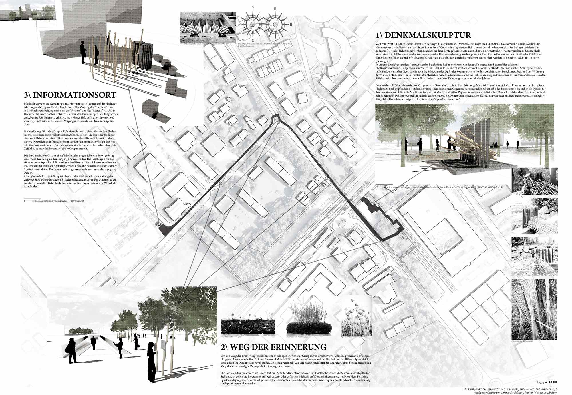 In Gedenken an die ehemaligen Zwangsarbeiterinnen einer Flachsröste im Dritten Reich sollte für diese Ausschreibung ein Ensemble aus aus drei Teilen entorfen werden. Ein Informationsort mit Denkmaltafeln, einer Denkmalskulptur und einer Reihe von Stelen mit Biographietafeln. Zusammen mit den Künstler*innen Simona De Fabritiis und Marian Wiesner entstanden folgender Beitrag.